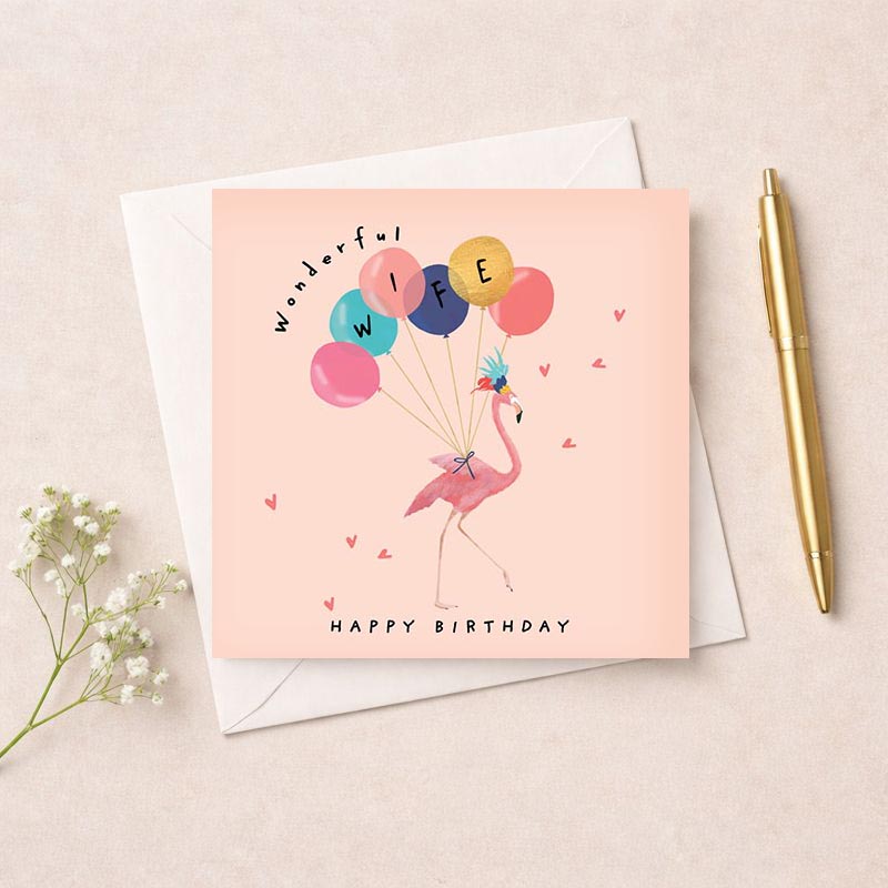 To a wonderful wife, happy birthday. Wish your amazing wife a happy birthday with this sweet birthday card, with a flamingo holding some balloons which spell out wife.