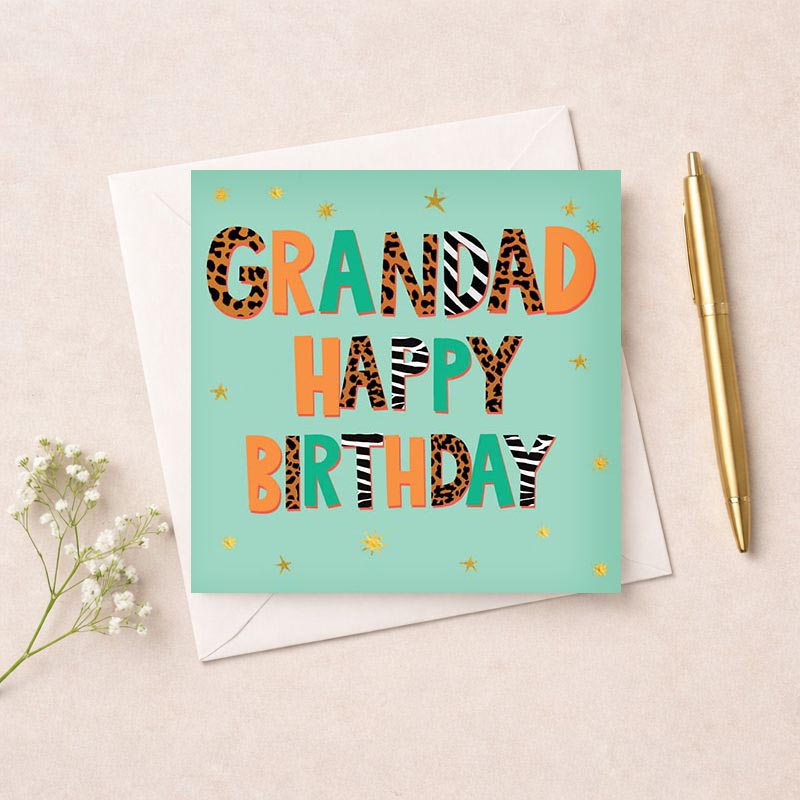Happy birthday grandad! Send your grandad this bright and fun birthday card with leopard spots and zebra stripes. It is complete with gold detailing too for a wonderful finish.