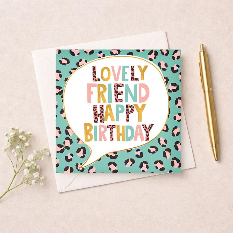 Lovely friend happy birthday to you! Wish your wonderful friend the happiest of birthdays with this lovely pink and teal and leopard print birthday card, complete with gold details.