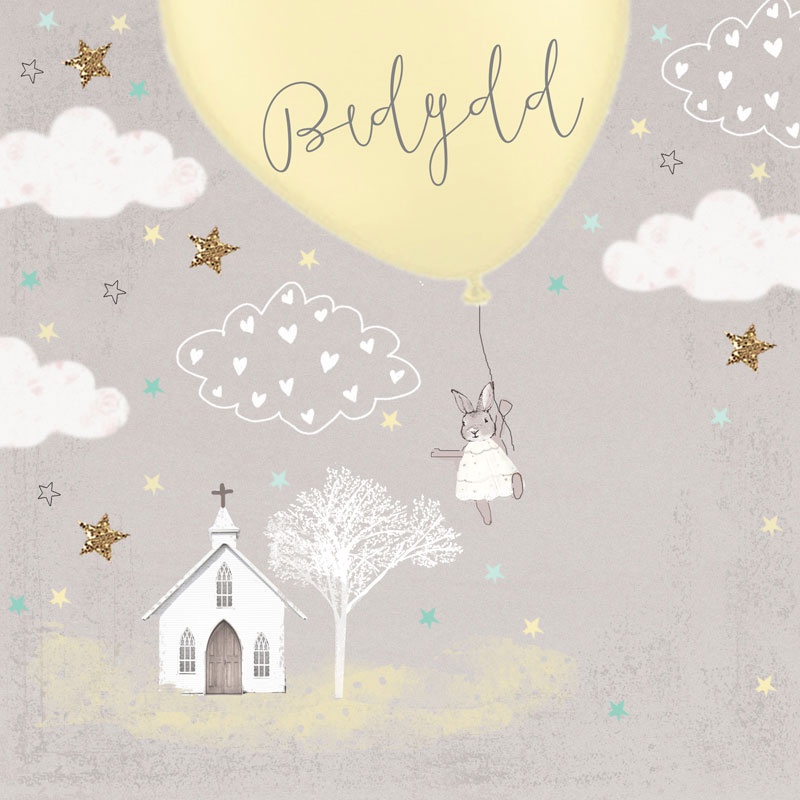 Celebrate a gorgeous christening with this stunning Welsh language card. It has a sweet bunny holding onto a big balloon, floating down to the church.