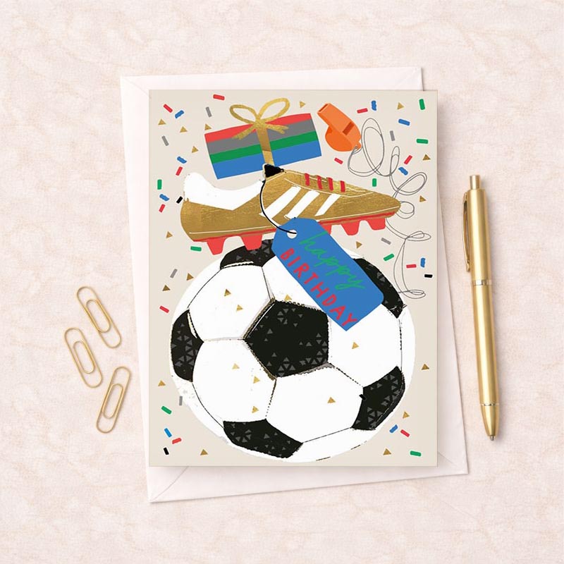 Score big with our striking A4 size greetings card featuring a bold football, a gleaming gold football boot, a beautifully wrapped birthday present, and a prominent whistle! With this dynamic design, we're kicking off the celebration in style, ready to make your birthday a championship-worthy event.