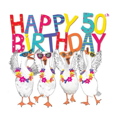 Show your appreciation in style with this stunning white greeting card, featuring three cheerful geese dancing with joy, wearing sunglasses and vibrant floral leis. The lively, fun design is paired with the bold, colourful message “Thank You”, written in big, eye-catching letters to express your gratitude with flair.