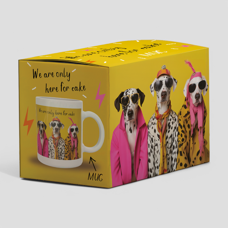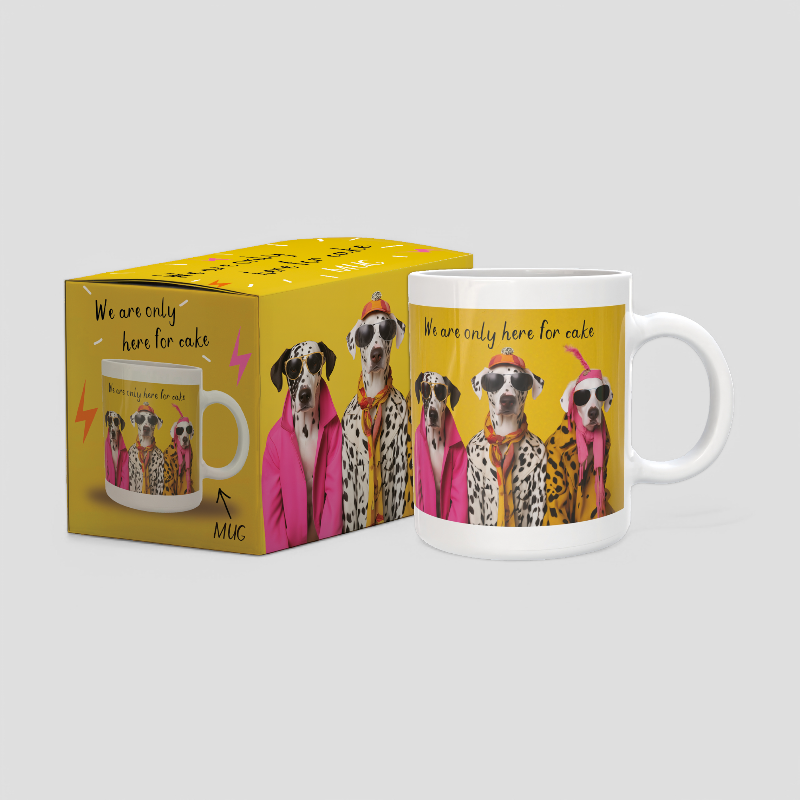 Add some fun to your day with our We Are Only Here for Cake Mug! This vibrant design features three stylish Dalmatians, rocking colourful clothes and sunglasses, living their best lives with a playful attitude. Paired with the cheeky phrase “We Are Only Here for Cake”, this mug is perfect for cake lovers, dog enthusiasts, and anyone who appreciates a good laugh.