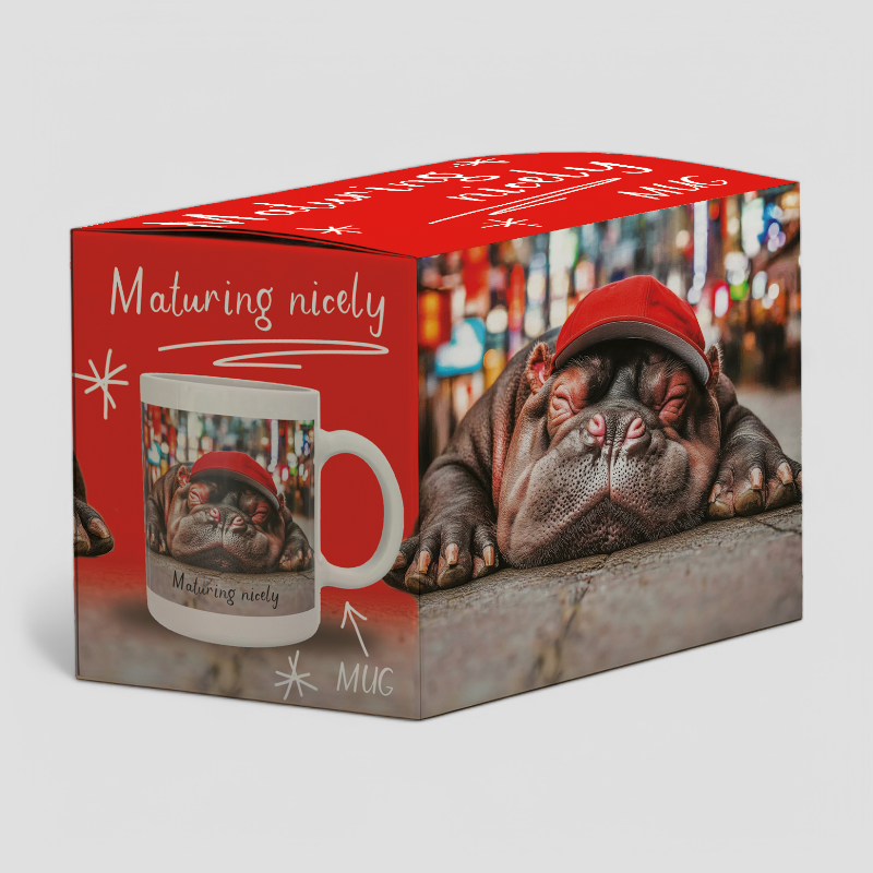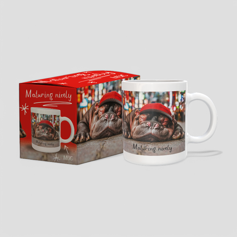 Relax and unwind with our Maturing Nicely Mug! This adorable design features a sweet hippo peacefully asleep, wearing a red cap, looking absolutely cozy and content. With the playful phrase “Maturing Nicely”, this mug is perfect for anyone who knows that getting older just means getting even better!
