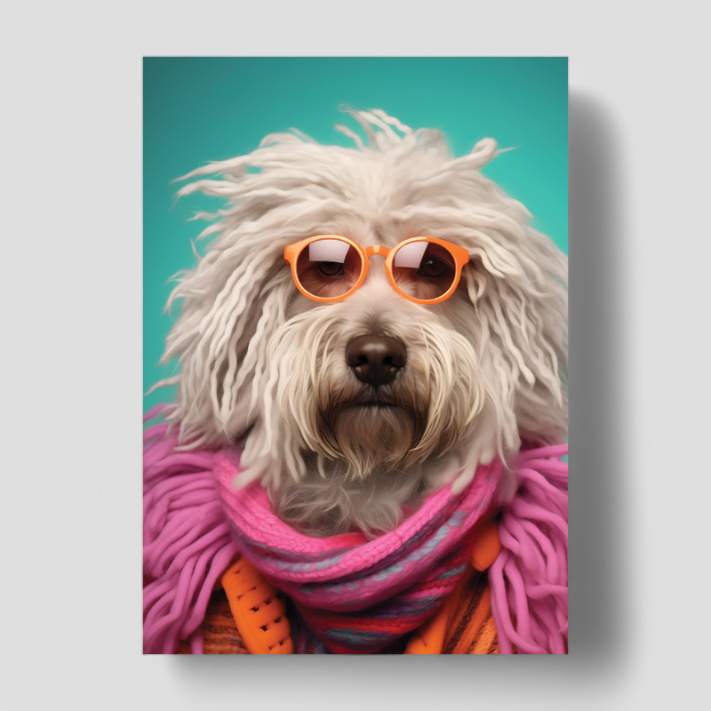 A white shaggy dog wearing a pink scarf and cool sunglasses