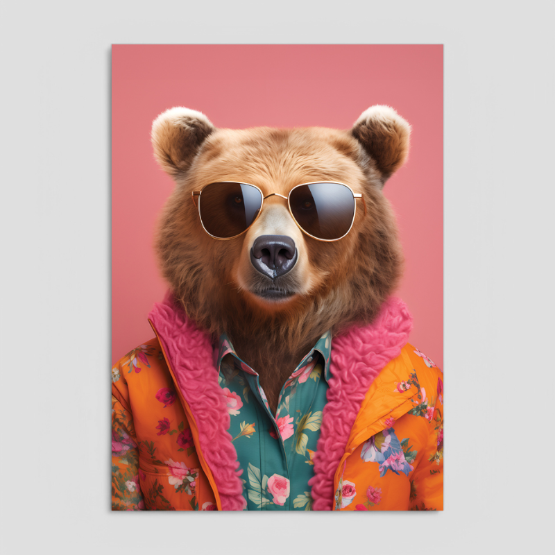 A stylish brown bear in sunglasses and a funky blazer