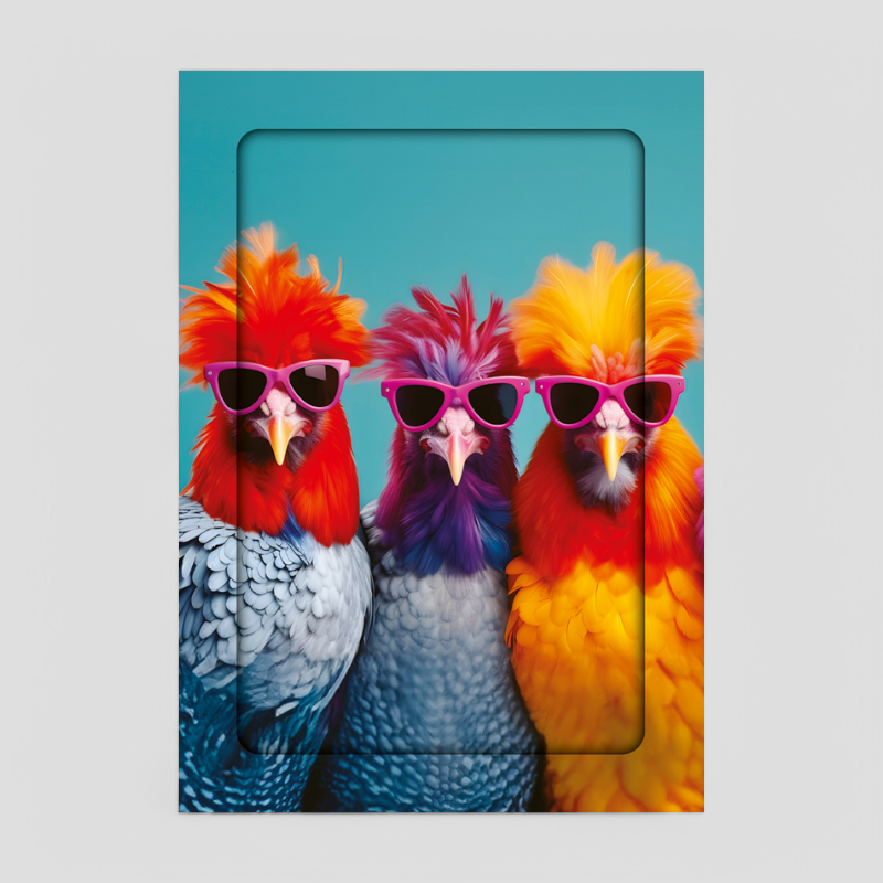 One design showcases three bright and bold chickens, all rocking stylish pink sunglasses with plenty of attitude. The second design features four trendy little chicks, dressed in cool outfits and colourful sunglasses, bringing a burst of personality to every note.