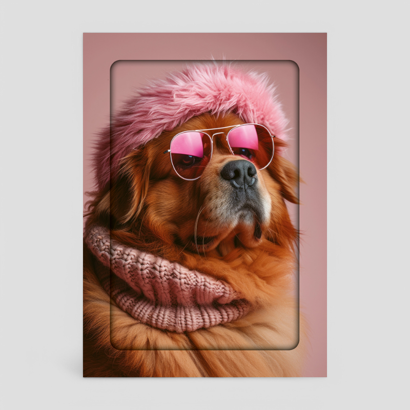One design showcases a white shaggy dog set against a bold pink background, looking effortlessly cool in vibrant orange sunglasses. The second design features a big, fluffy brown dog, dressed to impress in a cosy pink scarf, matching hat, and stylish pink sunglasses.