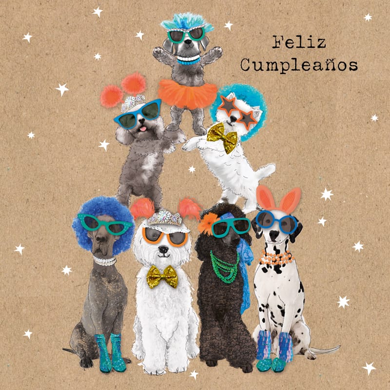 Three dachshunds in party hats, glasses, and crowns bring sparkle to this cheerful birthday card. With 'Herzlichen Glückwunsch', they’re ready to share the joy.