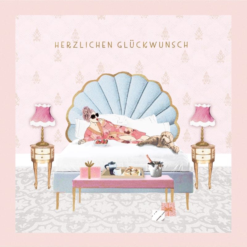 This vibrant French birthday card captures a lively scene of two stylish women cruising in a red convertible surrounded by gold and animal-print balloons. With 'Joyeux Anniversaire' written elegantly above, this design is ideal for a friend who loves fashion, freedom, and fun-filled birthday wishes with flair.