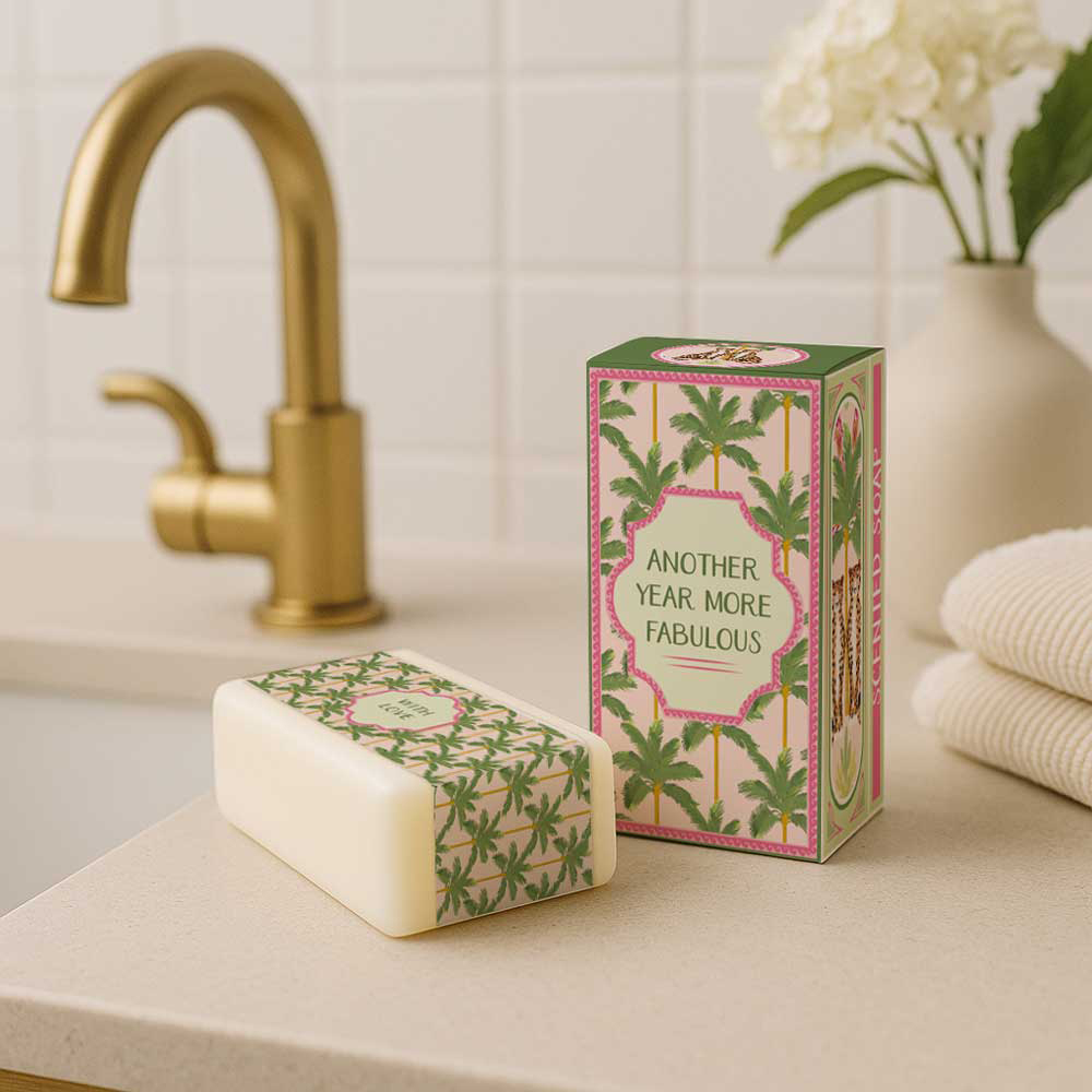 Celebrate a special birthday in fabulous style with this Another Year More Fabulous Aloe Vera & Cucumber Soap Bar. Beautifully designed with a chic palm tree motif and playful leopard print accents, this luxury soap makes a thoughtful birthday gift for friends and loved ones. Infused with nourishing aloe vera and refreshing cucumber, the rich lather gently cleanses and softens the skin, leaving it feeling beautifully fresh. Perfect for anyone who deserves a little pampering on their special day, this scented soap bar makes a delightful addition to any birthday hamper or gift box.