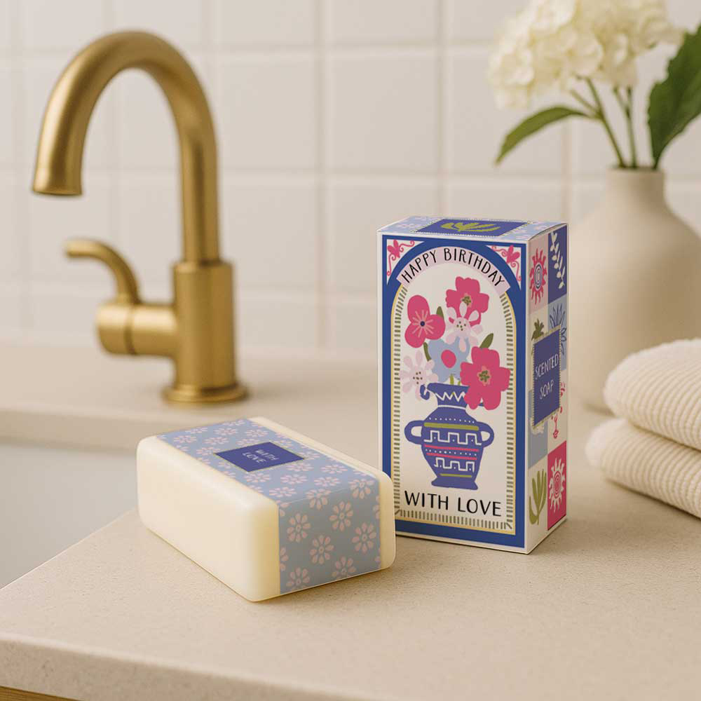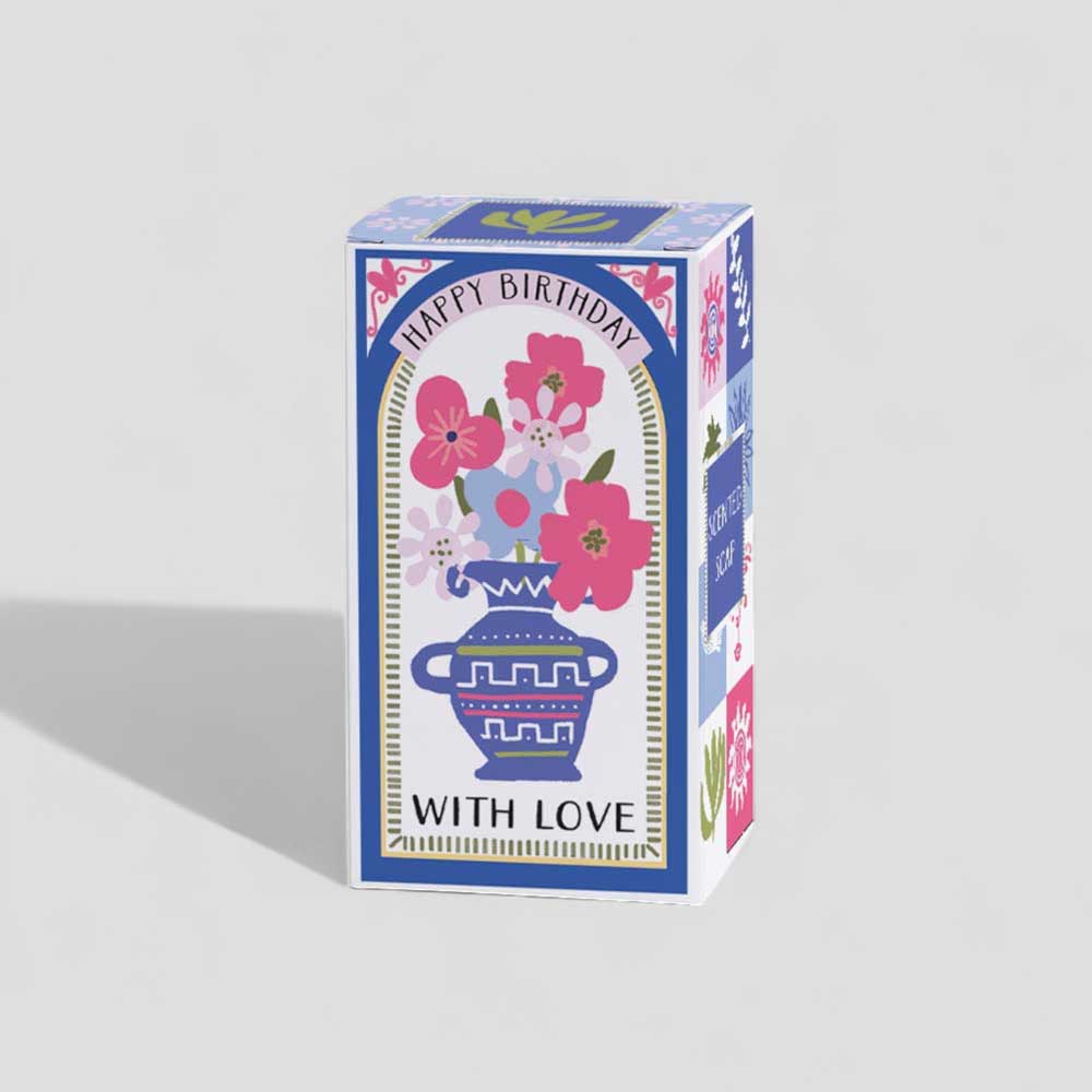 Send birthday wishes with love with this charming Happy Birthday With Love Aloe Vera & Cucumber Soap Bar, featuring a delightful blue vase filled with vibrant pink and white blooms. This gorgeously illustrated soap bar is the perfect birthday gift for friends, family or anyone you want to treat. The nourishing blend of aloe vera and cucumber provides a refreshing cleanse while leaving skin feeling soft and beautifully scented. A stylish and thoughtful addition to any birthday gift basket or care package.