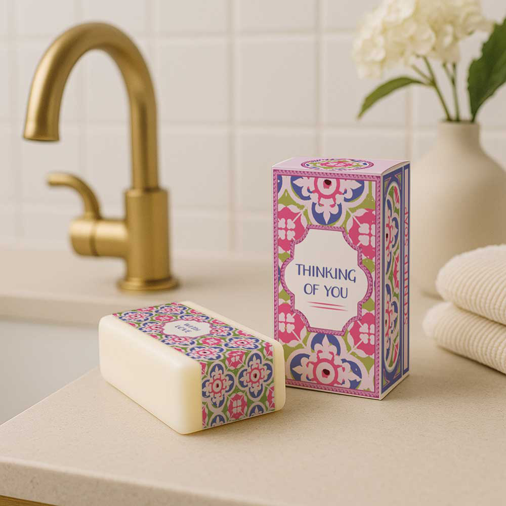 Let someone special know they’re in your thoughts with this elegant Thinking of You Aloe Vera & Cucumber Soap Bar. Decorated with a timeless floral pattern in shades of pink, blue and green, this luxury soap makes a beautiful and comforting gift. The gentle formula is enriched with soothing aloe vera and cucumber to pamper and care for the skin, leaving it cleansed and softly fragranced. Whether sent as a small token of affection or as part of a wellness hamper, this thoughtful soap bar is sure to brighten their day.