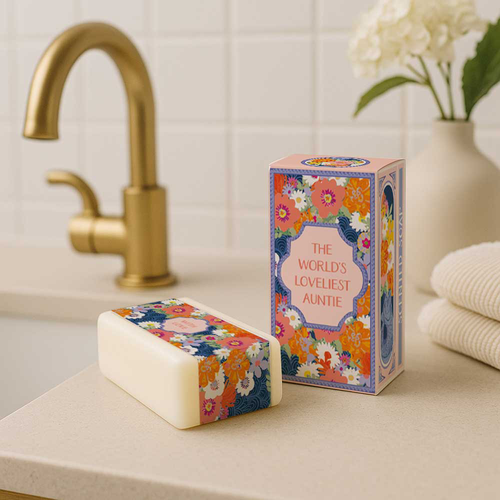 Celebrate your wonderful auntie with this cheerful The World’s Loveliest Auntie scented soap bar. Wrapped in a vibrant floral design bursting with colour, this luxurious aloe vera and cucumber soap makes a delightful birthday gift, thank you gift or just-because present. With a gentle fragrance and skin-loving formula, this special soap bar for auntie is sure to bring a smile.