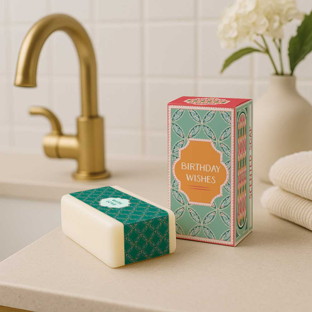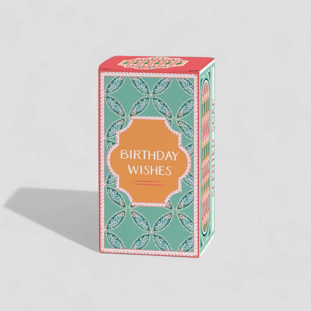 Send the loveliest birthday wishes with this Birthday Wishes scented soap bar. Featuring an elegant geometric design in mint and peach tones, this indulgent aloe vera and cucumber soap makes a charming birthday gift for friends, family or colleagues. With its skin-softening formula and subtle floral scent, this luxury soap bar is a delightful way to make their day extra special.