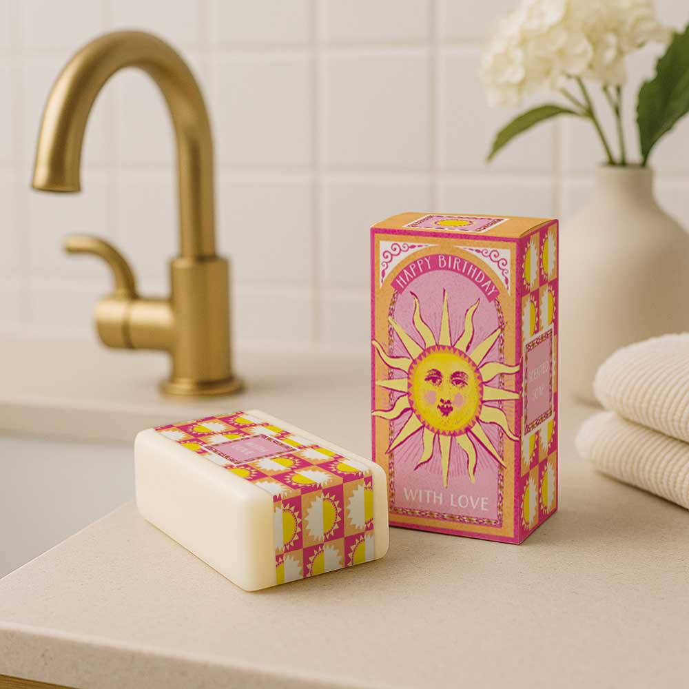 Bring sunshine and smiles with this striking sun-themed birthday soap bar. A vibrant, uplifting design combines with a gentle aloe vera and cucumber formula to cleanse and refresh. This joyful birthday gift soap is perfect for brightening someone’s day and makes a beautiful addition to any birthday pampering gift set. A cheerful way to celebrate and show you care.