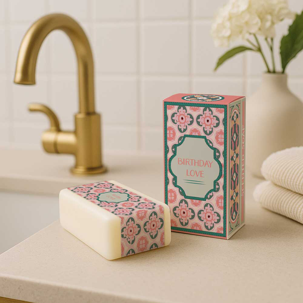 Send a warm, fragrant wish with this gentle vegetable-based soap, enriched with aloe vera and cucumber to leave skin feeling soft and refreshed. The box features an ornate pink and teal geometric pattern with the words “Birthday Love” displayed on the front — the perfect way to show someone special you’re thinking of them on their birthday.
