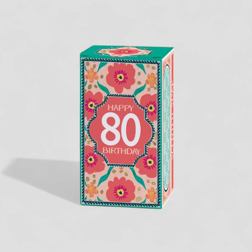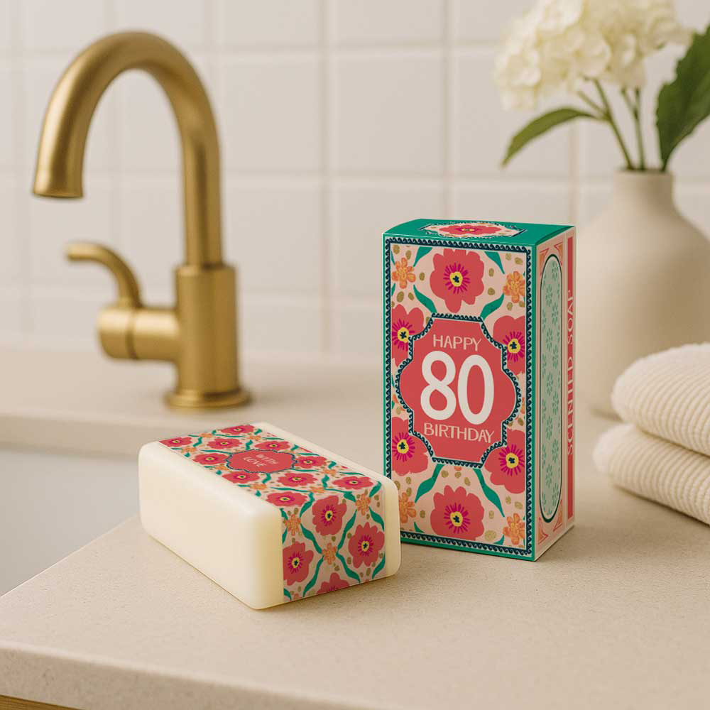 Pamper someone on their 80th birthday with this soothing vegetable-based soap, infused with aloe vera and cucumber. The skin is left feeling refreshed and lightly fragranced. The colourful gift box features a bold floral and decorative print in vibrant teal, pink and orange, with 'Happy 80 Birthday' on the front — a joyful and thoughtful gift.