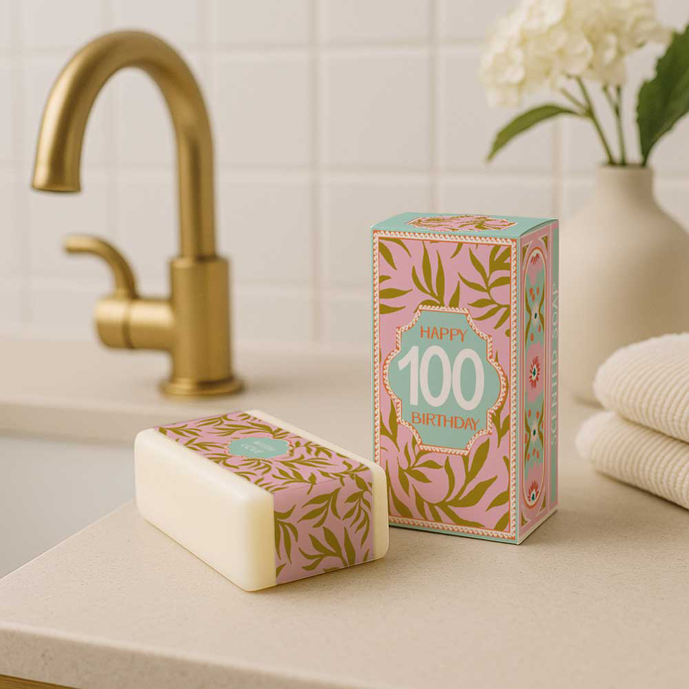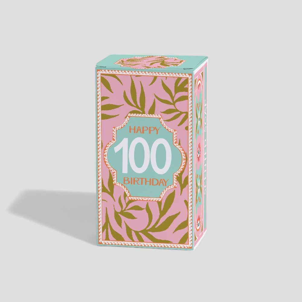 Celebrate an extraordinary 100th birthday with this indulgent and refreshing soap, enriched with aloe vera and cucumber. It cleanses and softens the skin while leaving a delicate scent. The beautifully illustrated box is adorned with an elegant leafy pattern in soft pink, green and gold tones, with 'Happy 100 Birthday' on the front — a special gift for a once-in-a-lifetime occasion.