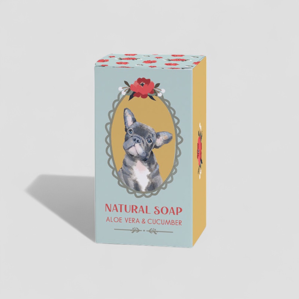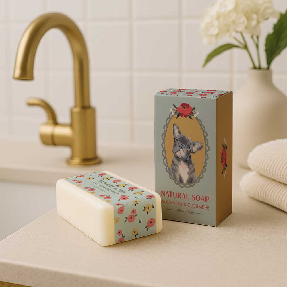 Featuring a chic design with a cute French Bulldog and a backdrop of charming florals, this aloe vera and cucumber soap bar is both decorative and practical. It cleanses gently while hydrating the skin, thanks to its nourishing ingredients. A lovely token for French Bulldog fans or anyone who loves combining skincare with stylish packaging.