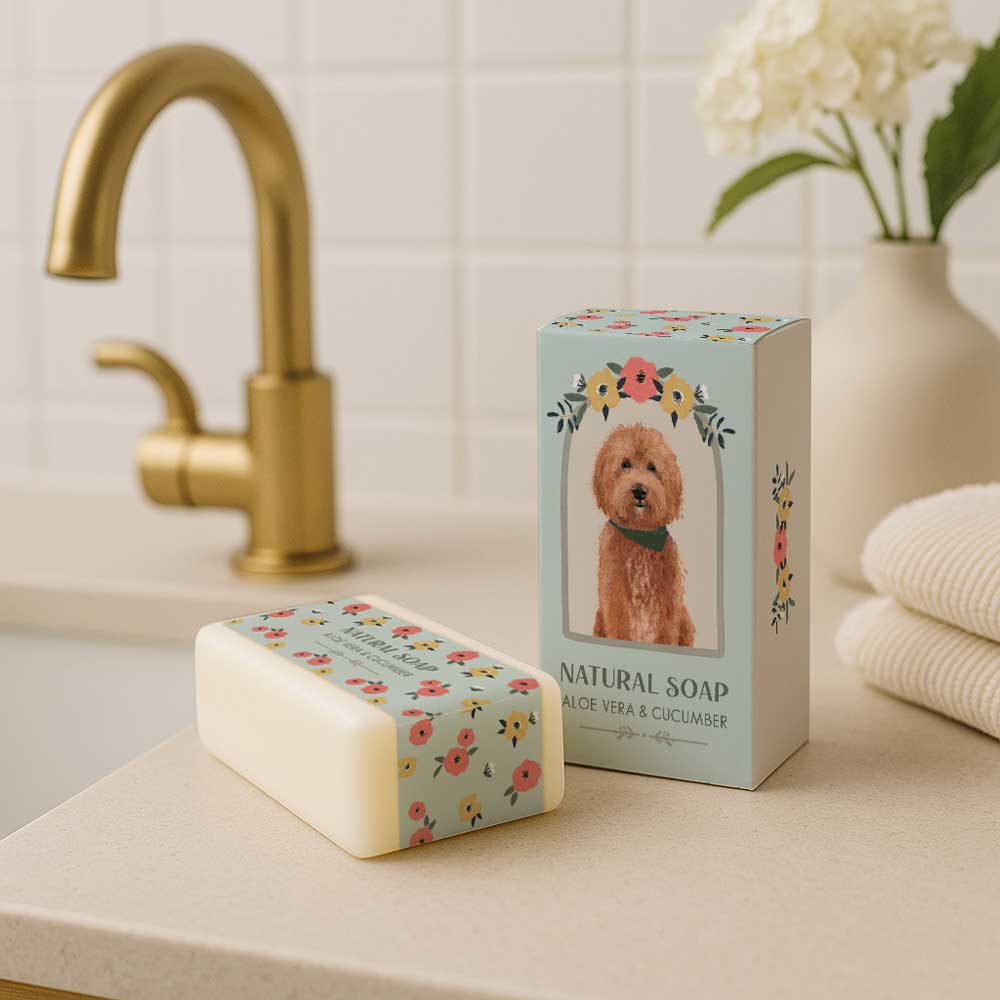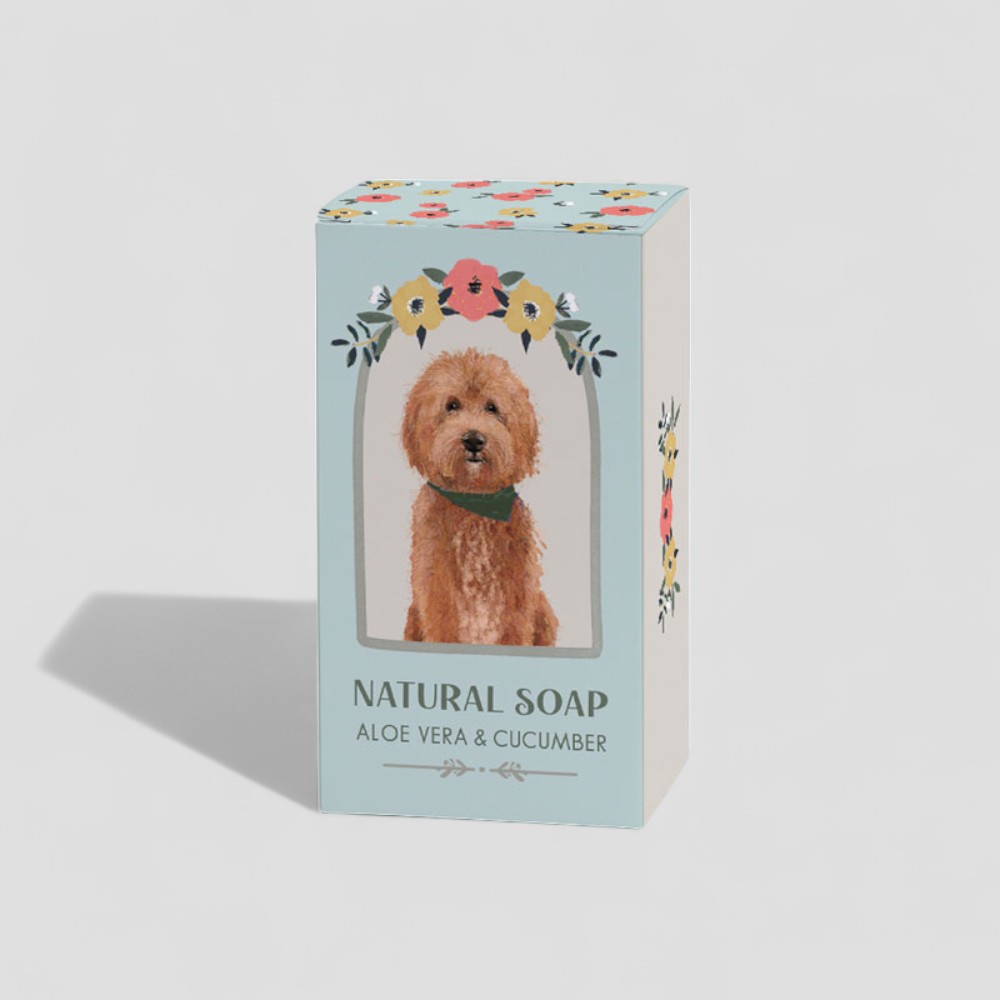 Charming and cheerful, this soap bar is wrapped in a whimsical design featuring a fluffy Cockapoo surrounded by floral prints. With its blend of aloe vera and cucumber, it offers a gentle cleanse and soothing hydration. Ideal for Cockapoo fans and those who love to celebrate their favourite pups in every aspect of life.