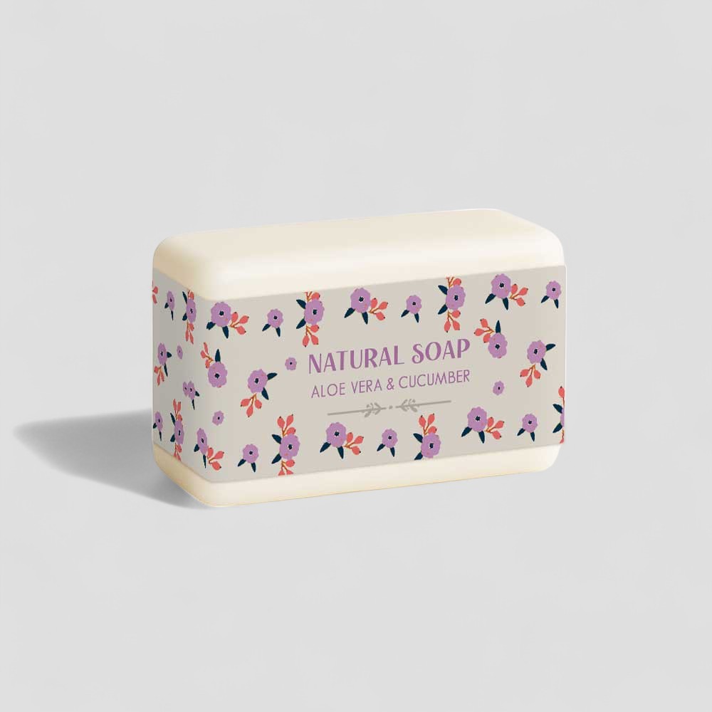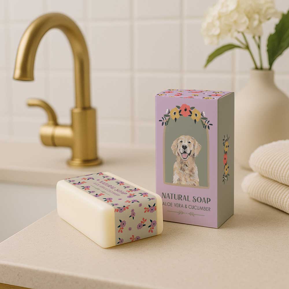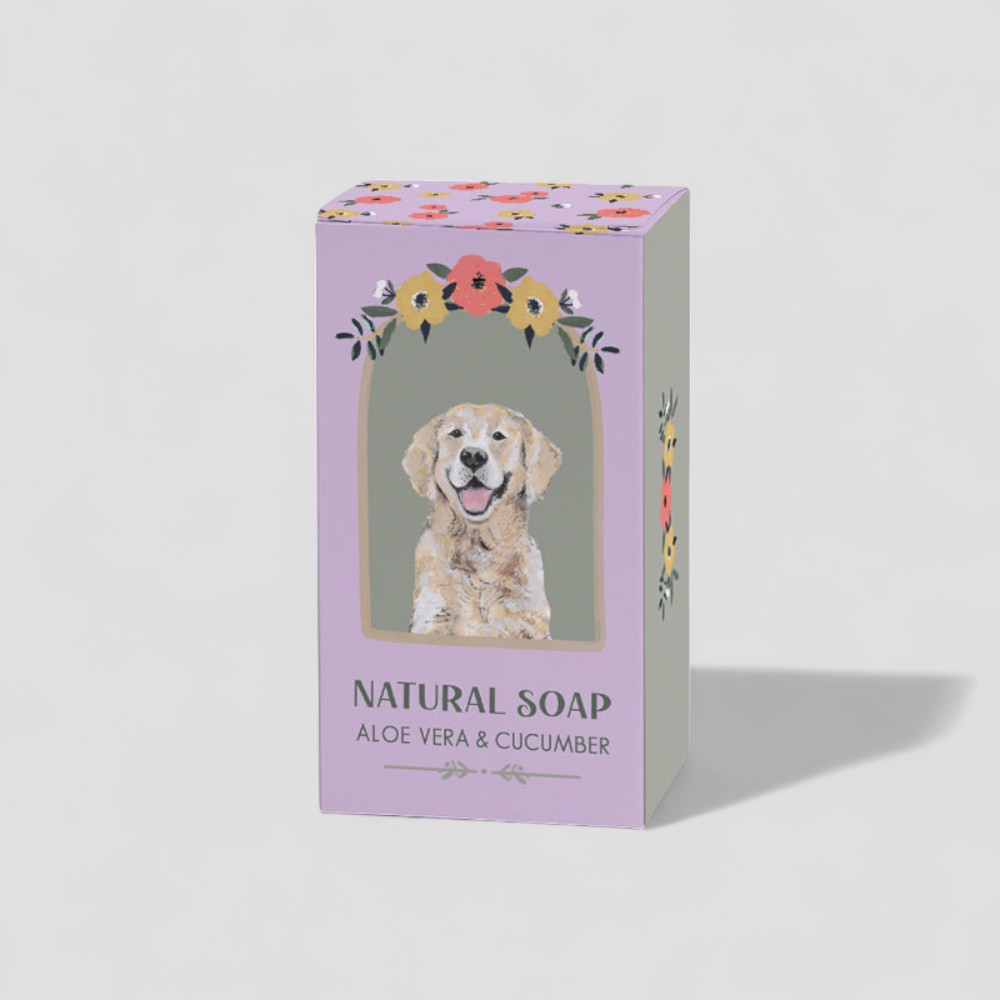 Infused with refreshing aloe vera and cool cucumber, this natural soap provides a gentle, rejuvenating cleanse. The wrapper showcases the ever-cheerful Golden Retriever, framed by a lovely arch of peach and yellow flowers on a lilac background. Perfect for dog lovers who appreciate loyal companions and a touch of joy in their skincare routine.
