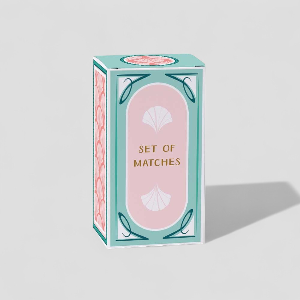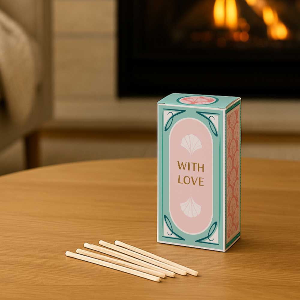 An elegant box of matches featuring an art deco-inspired fan design in soft pink and teal tones. With the words “With Love” on the front and 90 matches inside, this stylish box is a practical and beautiful addition to any room, ideal for lighting candles, log fires, and more.