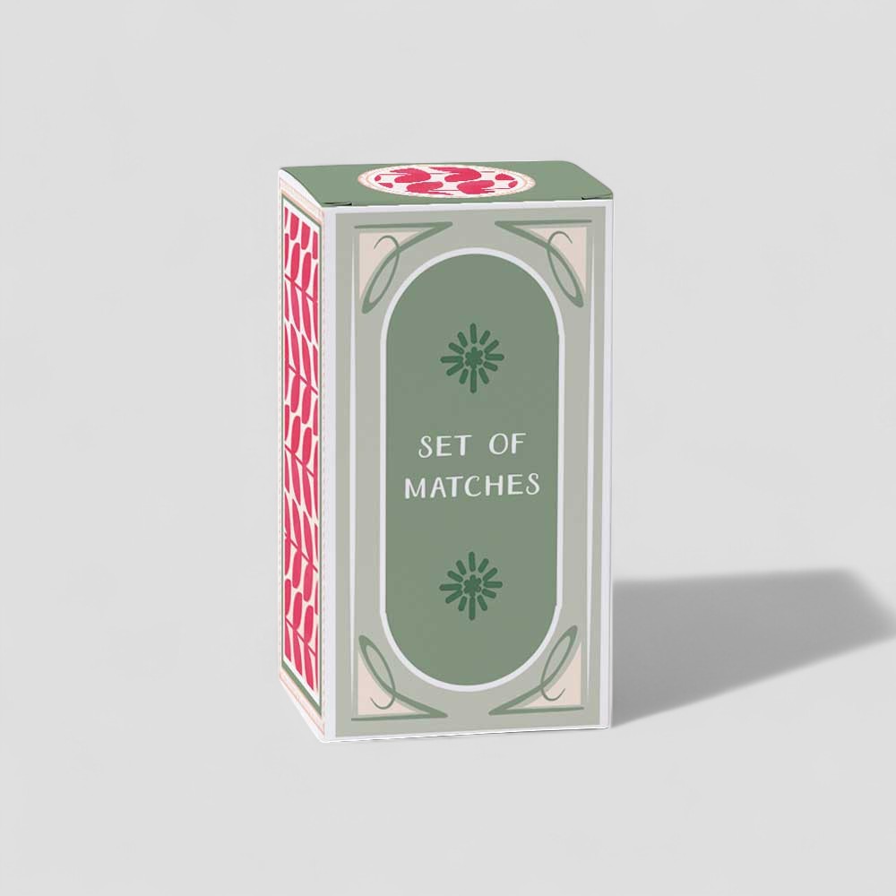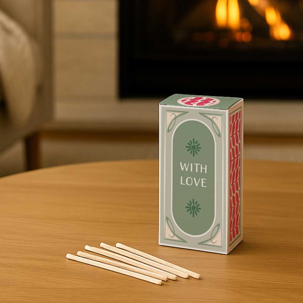 A stylish box of matches featuring a sage green background with berry-hued leaf motifs and elegant botanical accents. The simple 'With Love' message on the front makes it a versatile gift. Inside are 90, matches, ideal for lighting candles and cosy evenings.