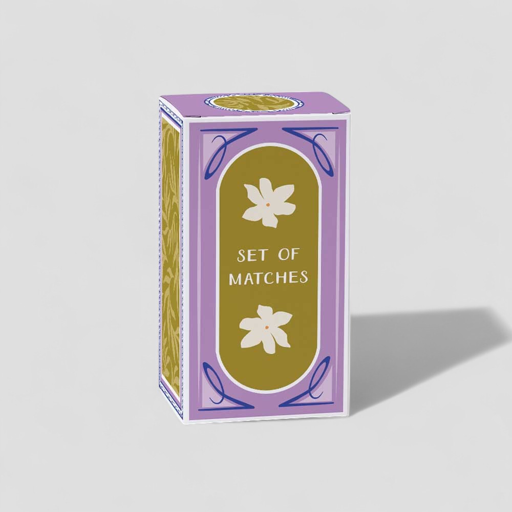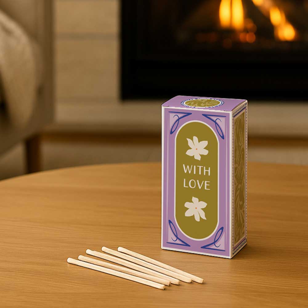 A striking and elegant box of matches in soft lilac with gold leaf accents. The front message 'With Love' makes it ideal for gifting or keeping on display at home. Contains 90 matches, perfect for lighting candles or adding a warm glow to any setting.