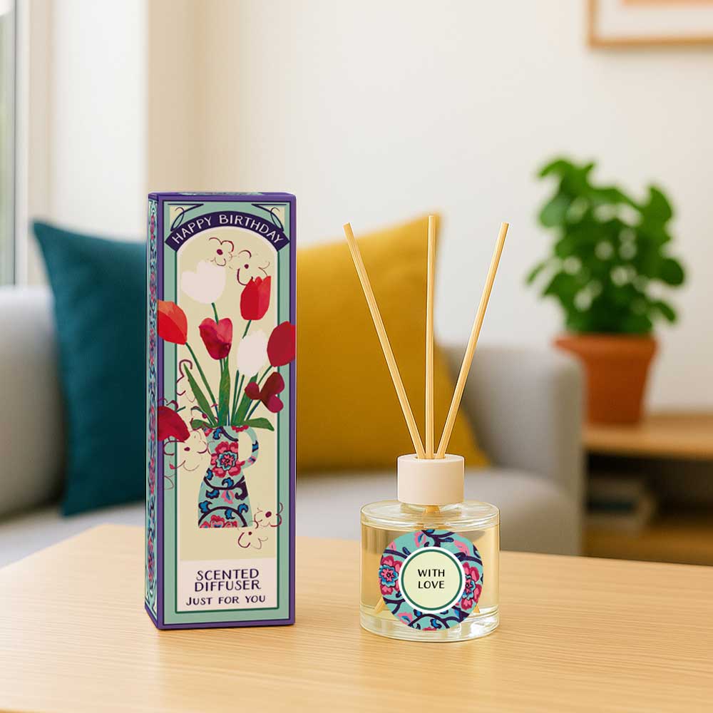 Brighten someone’s birthday with this cheerful Lime & Basil Reed Diffuser, featuring a vibrant tulip bouquet illustration in a decorative blue vase. The scent combines energising lime with herbaceous basil, creating a clean and refreshing atmosphere that lasts for up to 8 weeks.