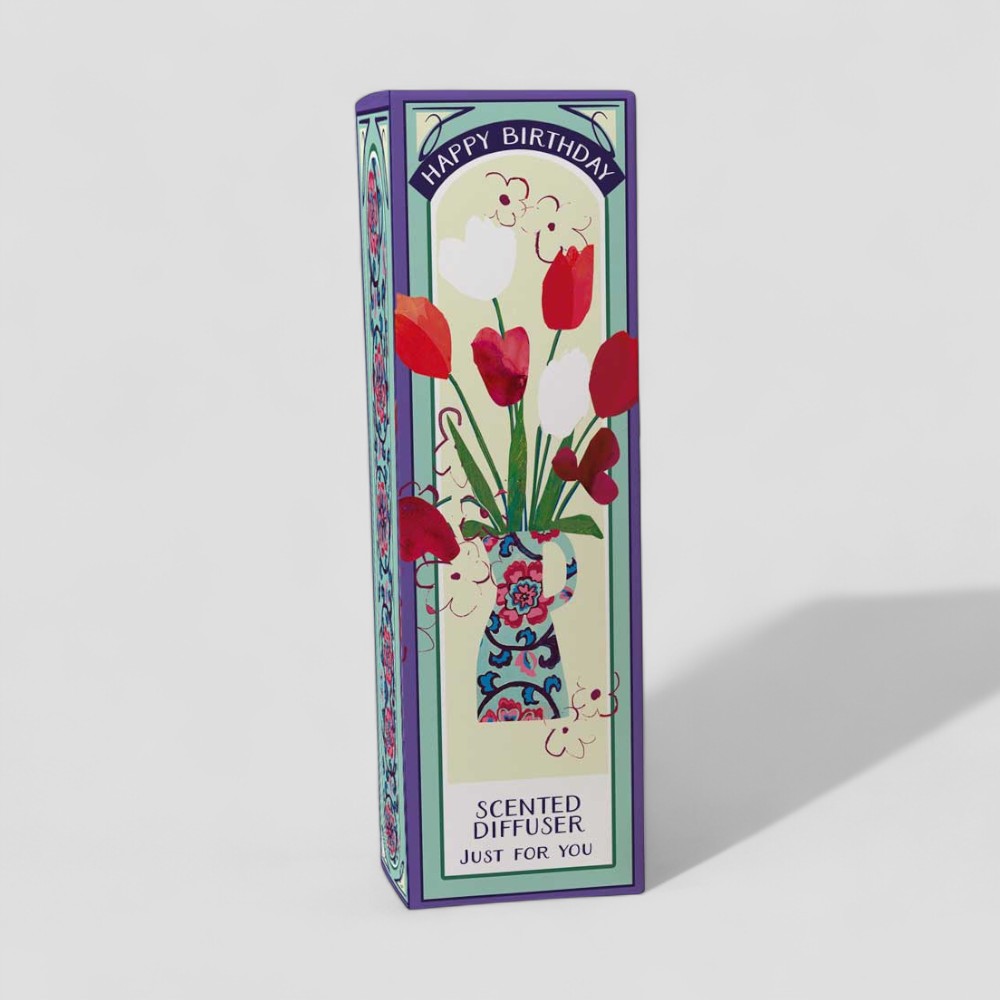 The packaging is rich with colour, from the red and white tulips to the ornate floral panels, and is topped with a curved "Happy Birthday" banner that adds a festive finishing touch. A perfect scented gift for a friend, colleague or loved one who enjoys beautiful design and uplifting aromas.