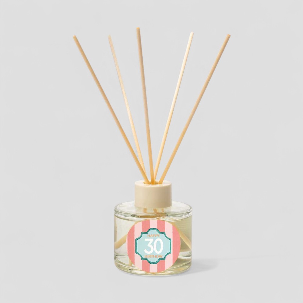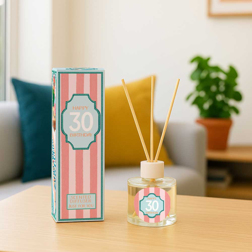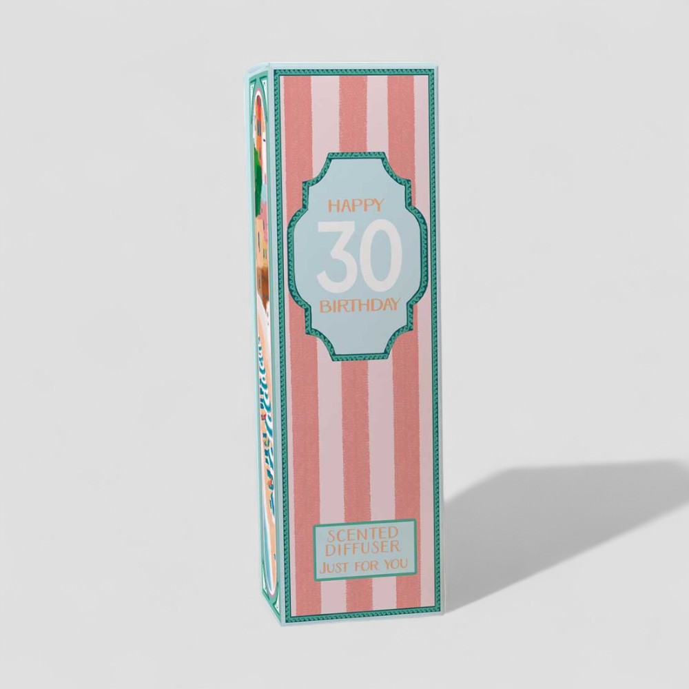 Welcome the next decade with the serene scent of lime and basil in our Happy 30th Birthday diffuser. The packaging features a whimsical coastal village design with rows of boats and soft stripes, giving off Mediterranean holiday vibes. A meaningful 30th birthday gift for her, this elegant diffuser adds charm and tranquillity to any living space.