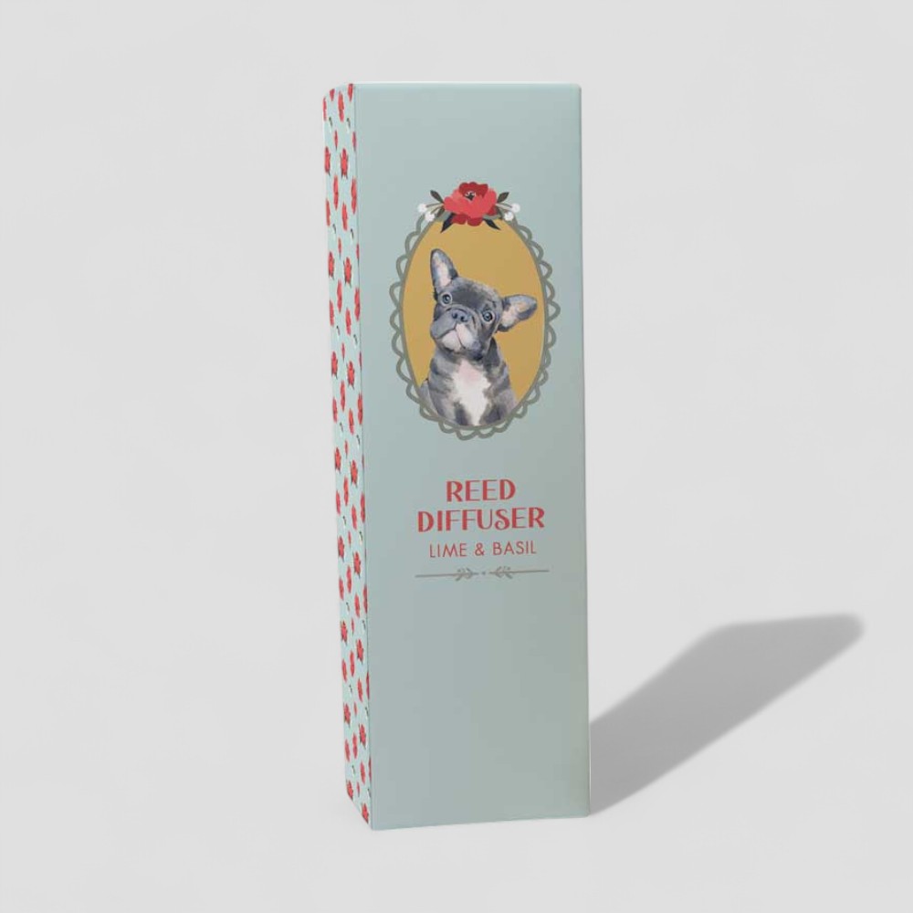Enjoy the lively and refreshing fragrance of our Lime & Basil Reed Diffuser. The 100ml diffuser fills any space with the perfect blend of zesty lime and warm basil. The gift box features a cute French Bulldog design, framed by an arch and surrounded by flowers, making it an ideal gift for anyone who loves this lovable, compact breed.