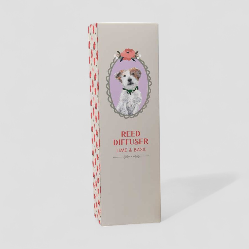 Infuse your space with the bright scent of our Lime & Basil Reed Diffuser. This 100ml diffuser features the uplifting combination of lime and basil. The gift box design showcases a spunky Jack Russell, framed in an arch with soft flowers, making it the ideal gift for lovers of this energetic and playful breed.