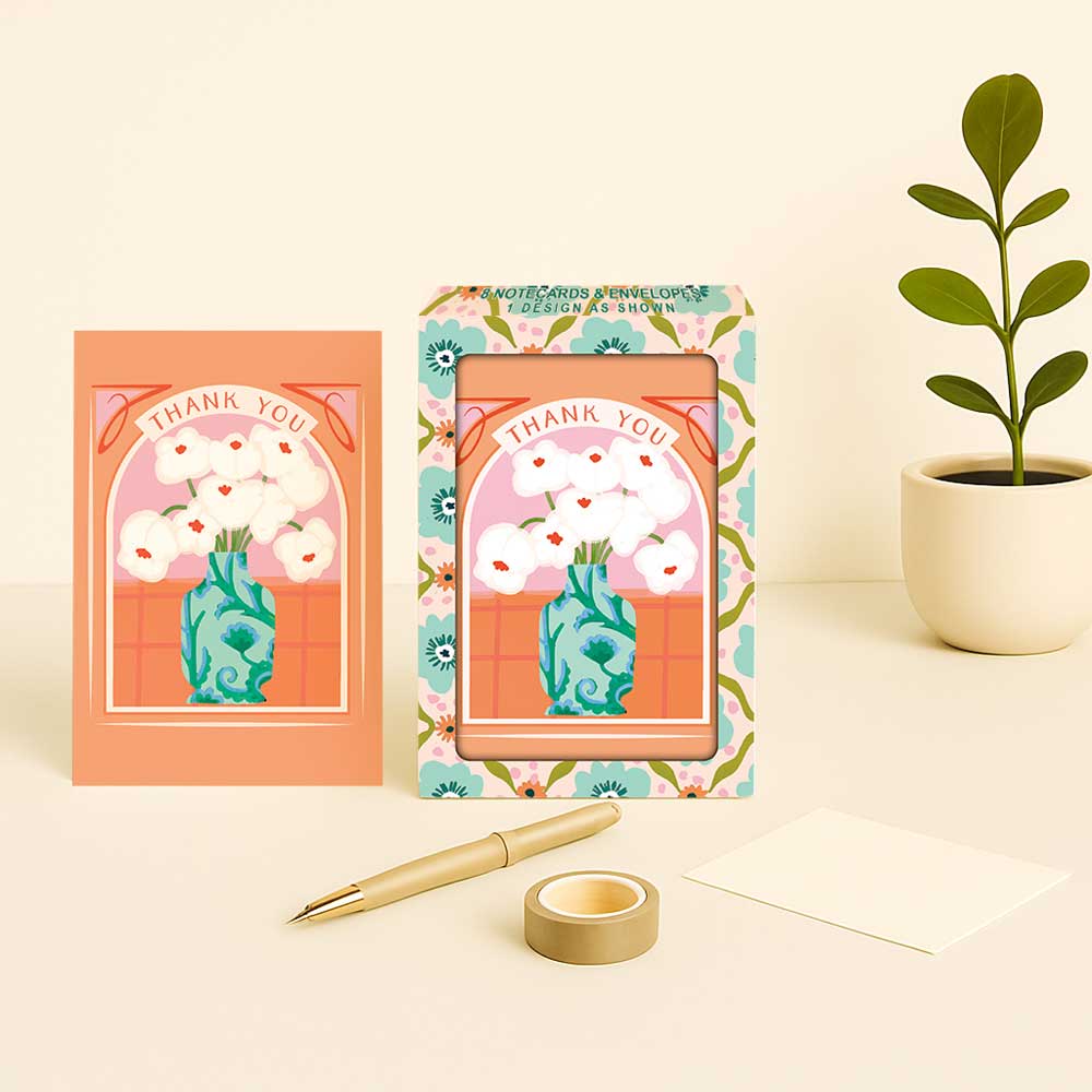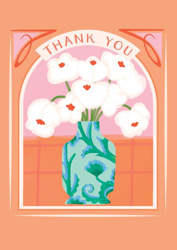 Say thank you in style with this elegant set of floral thank you cards, showcasing delicate white poppies arranged in a richly patterned turquoise vase. Set against a warm terracotta background and framed with the words ‘Thank You’, this sophisticated design blends contemporary colour with vintage-inspired charm.